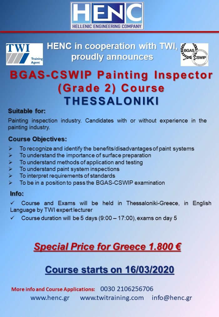 Update: New starting date: 29/06/2020 in Thessaloniki TWI authorized training and examination services agent for Greece and Cyprus The Hellenic Engineering Company in collaboration with TWI will implement on the 16th of March 2020 in Thessaloniki the training program and examinations which lead to the internationally recognized certification: BGAS-CSWIP Painting Inspector Grade 2 The British Gas…