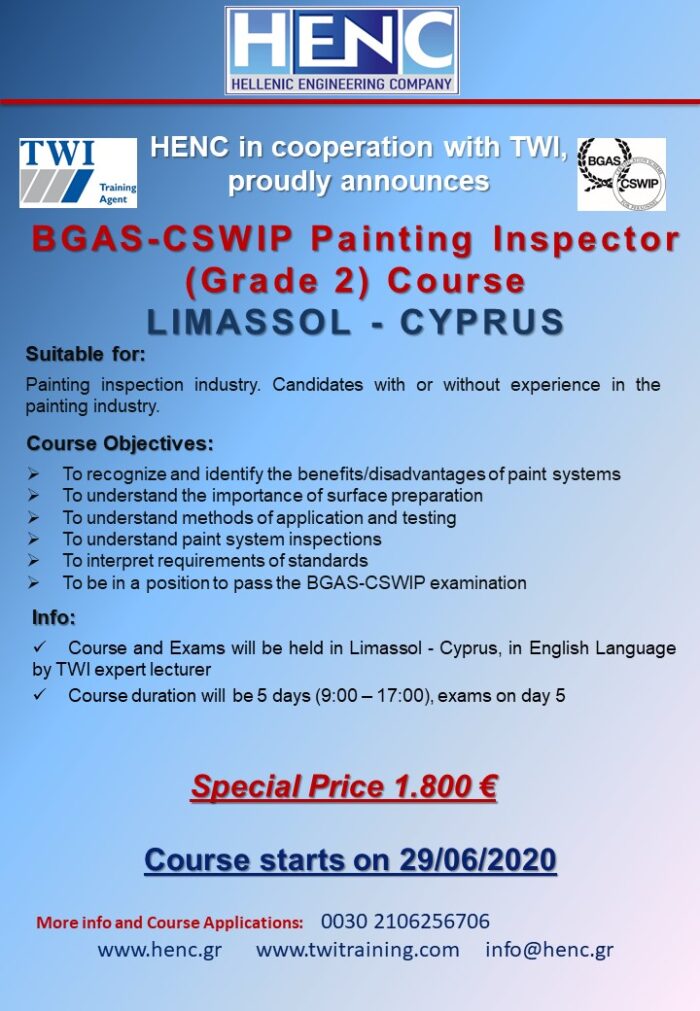 TWI authorized training and examination services agent for Greece and Cyprus The Hellenic Engineering Company in collaboration with TWI will implement on the 11th of January 2020 the training program and examinations which lead to the internationally recognized certification: BGAS-CSWIP Painting Inspector Grade 2 Due to COVID 19 pandemic the course will be delivered online live …